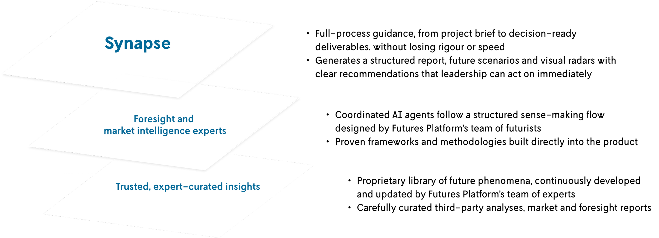 Unlike generic AI tools, every component of Synapse — from its AI agents to its futurist-curated content and underlying methodology — is firmly future-focused to support future-fit decision-making under persistent uncertainty.